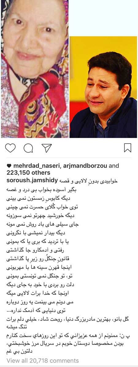 از دست دادن مادر سروش جمشیدی بازیگر طنز دورهمی را به ایشان تسلیت میگوییم و از خداوند منان میخواهیم روحش شاد باشد.