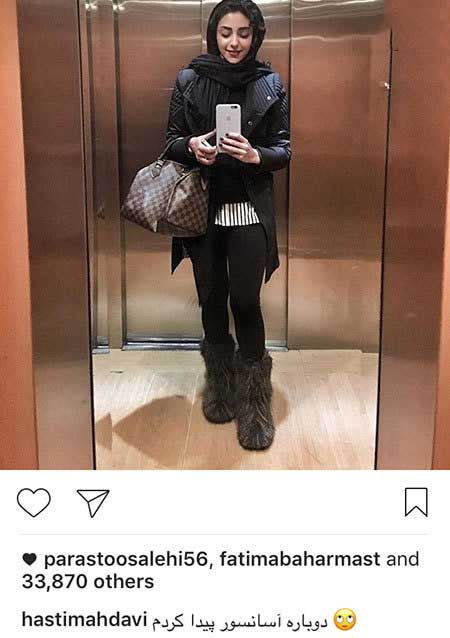 هستی مهدی فر در آسانسور دوباره عکس انداخت. ظاهرا اون در این عکس قصد دارد پز چکمه هایش را بدهد.